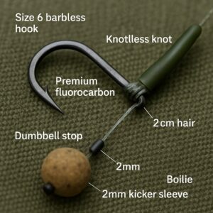 Advanced Construction: Begin with a knotless knot tying a size 6 curved-shank barbless hook to 25cm of quality fluorocarbon. Leave a precise 2cm hair and stop your chosen boilie with a dumbbell stop rather than traditional bait stops – they’re less conspicuous and more reliable.