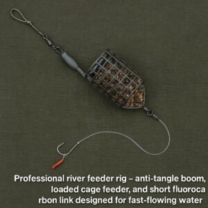 Flow Adjustment: In heavy flow, increase feeder weight rather than shortening the hooklink. Maintain that critical bait separation while ensuring the rig holds position.